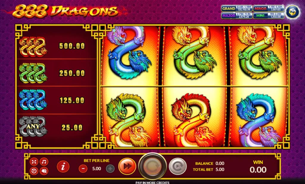 888 Dragons สล็อตออนไลน์ SLOTXO มาในรูปแบบของธีมมังกรสามสี ซึ่งแต่ละสีจะมีอัตราการจ่ายเงินรางวัลที่แตกต่างกันออกไปเพย์ไลน์ของเกมมีทั้งหมด 1 เพย์ไลน์ เพียงเท่านั้น slotxo mobile ที่คำนวณอัตราการชนะของแต่ละรอบได้ง่ายๆ เพียงหมุนสปินให้ได้สัญลักษณ์เดียวกันเรียง 3 ช่อง หากสำเร็จรับเงินรางวัลได้ทันที